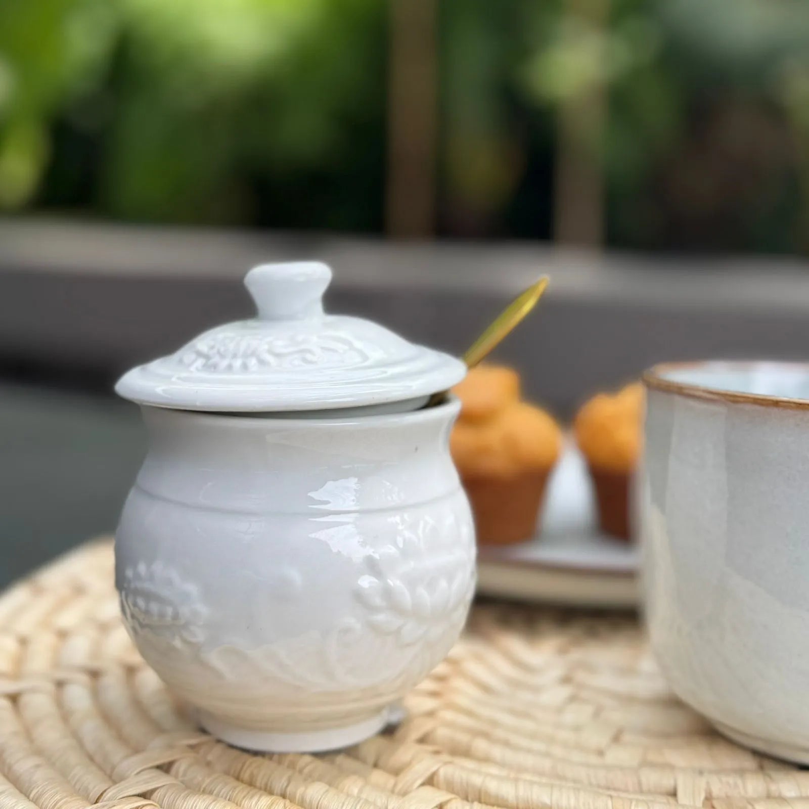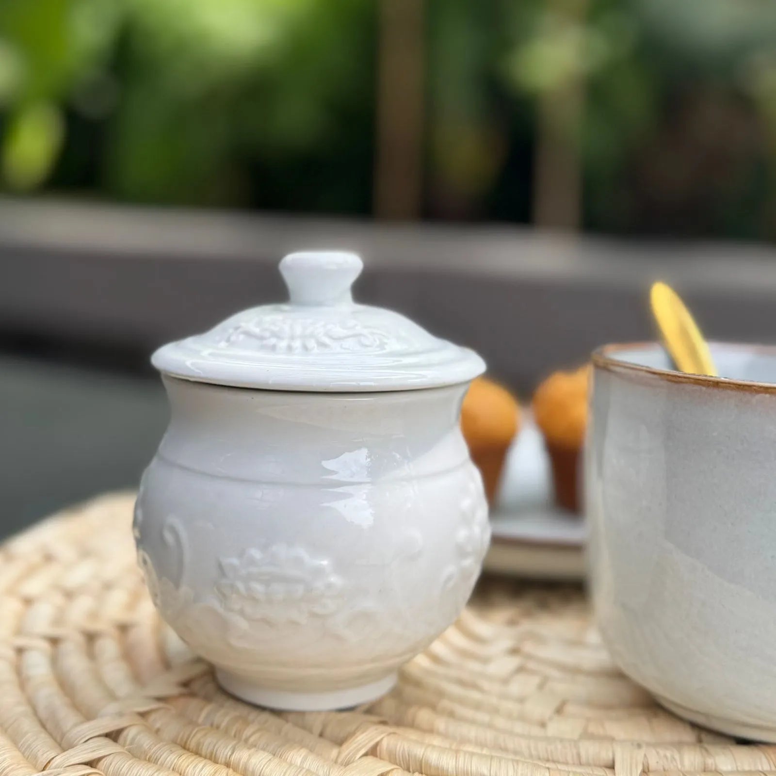 Enamórate de este lindo Azucarero diseño flor. Es el complemente perfecto para tu mesa, bandeja o estación de café. Su diseño clásico y delicado se realza con flores en relieve por todo el azucarero, que le dan un aire romántico. Incluye una tapa a juego que ayuda a mantener el azúcar siempre fresco y protegido. Ideal para el uso diario o para ocasiones especiales, este azucarero no solo es funcional, sino también una pieza decorativa que aporta calidez y estilo a tu cocina.
