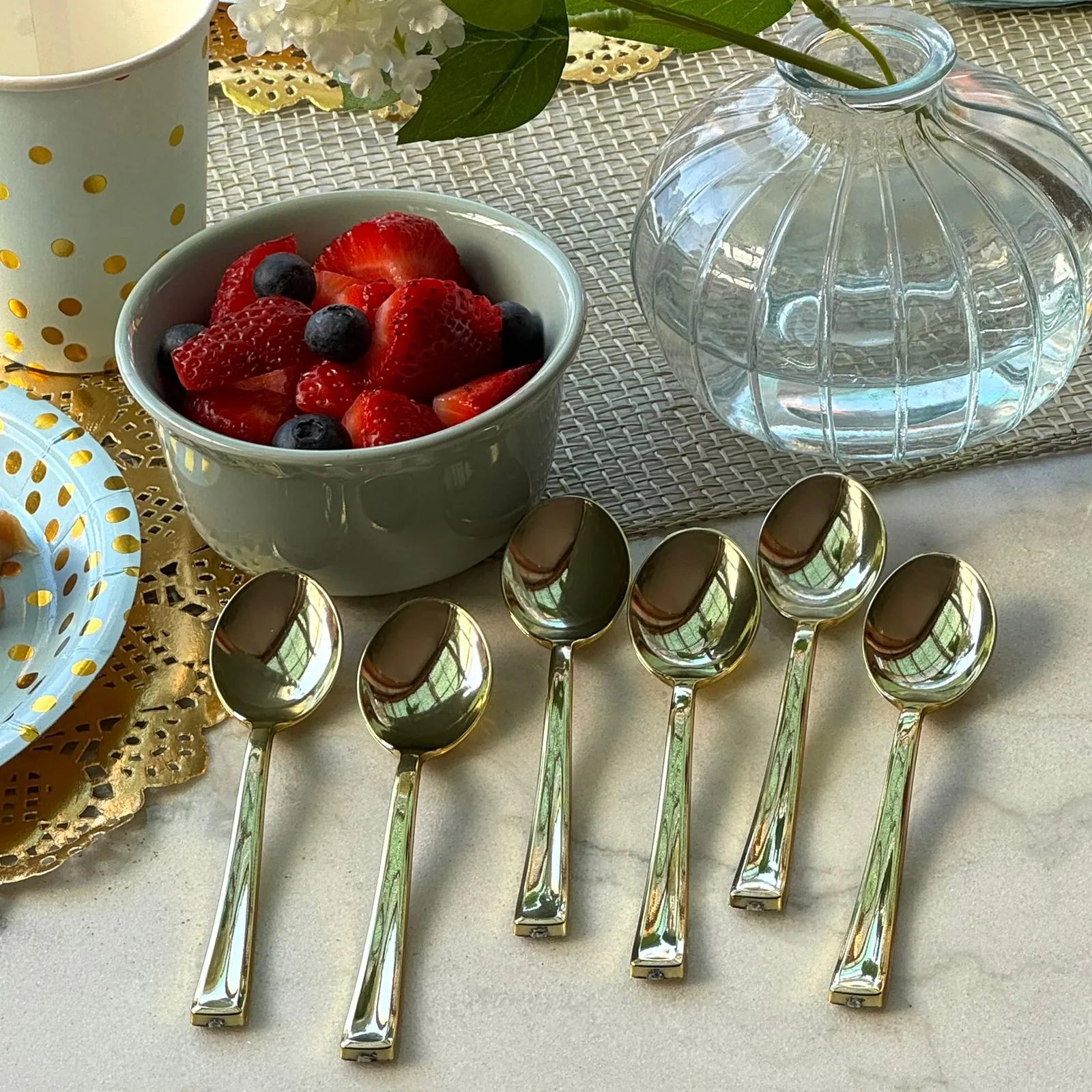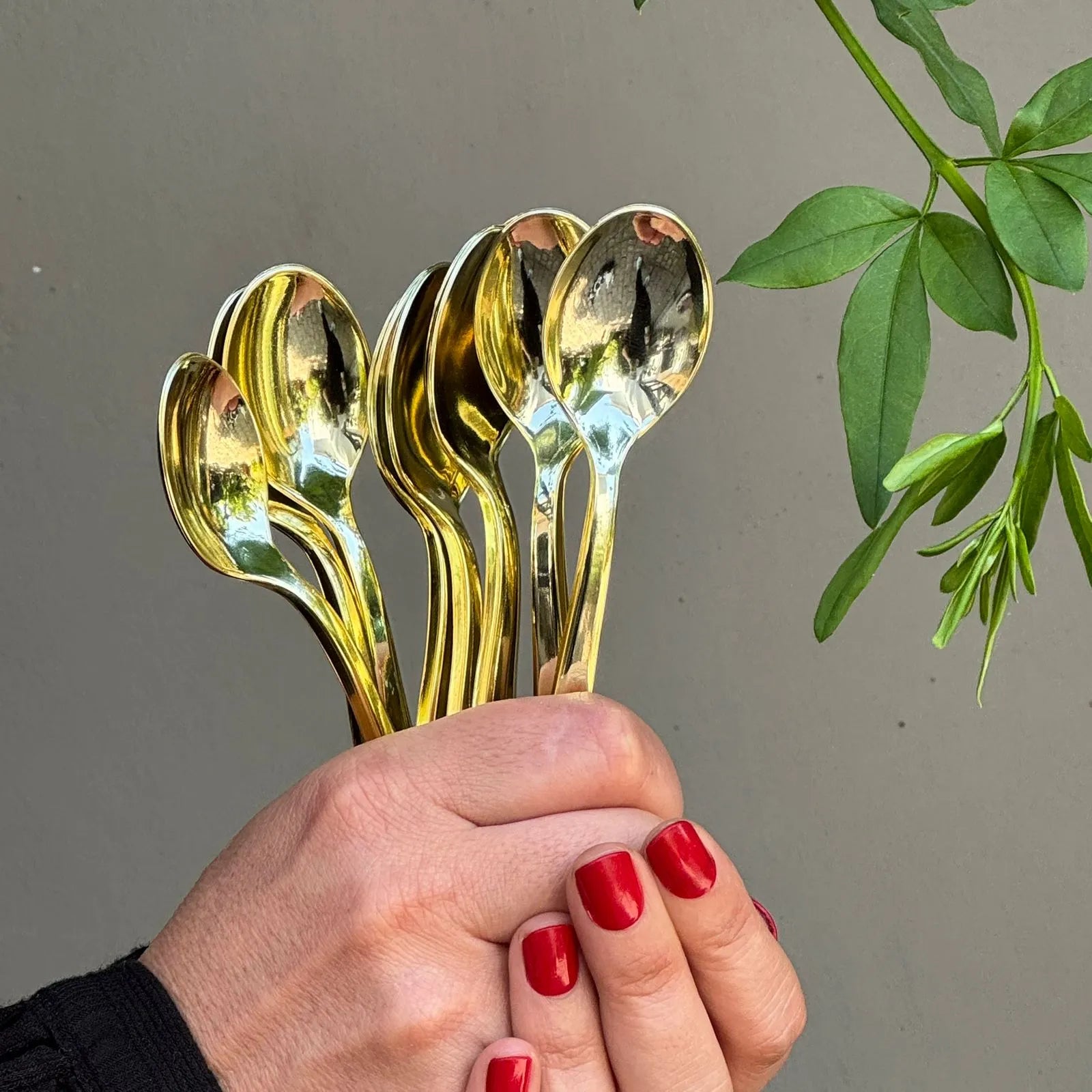 Decora tu mesa con este práctico set 12 cucharas plásticas doradas S (13 cm). Son ideales para cumpleaños, fiestas y celebraciones, también para un picnic o lo que tú quieras. Se pueden desechar o  reutilizar las veces que quieras. Combínalo con nuestros productos de celebraciones y arma una mesa soñada y sin complicaciones.