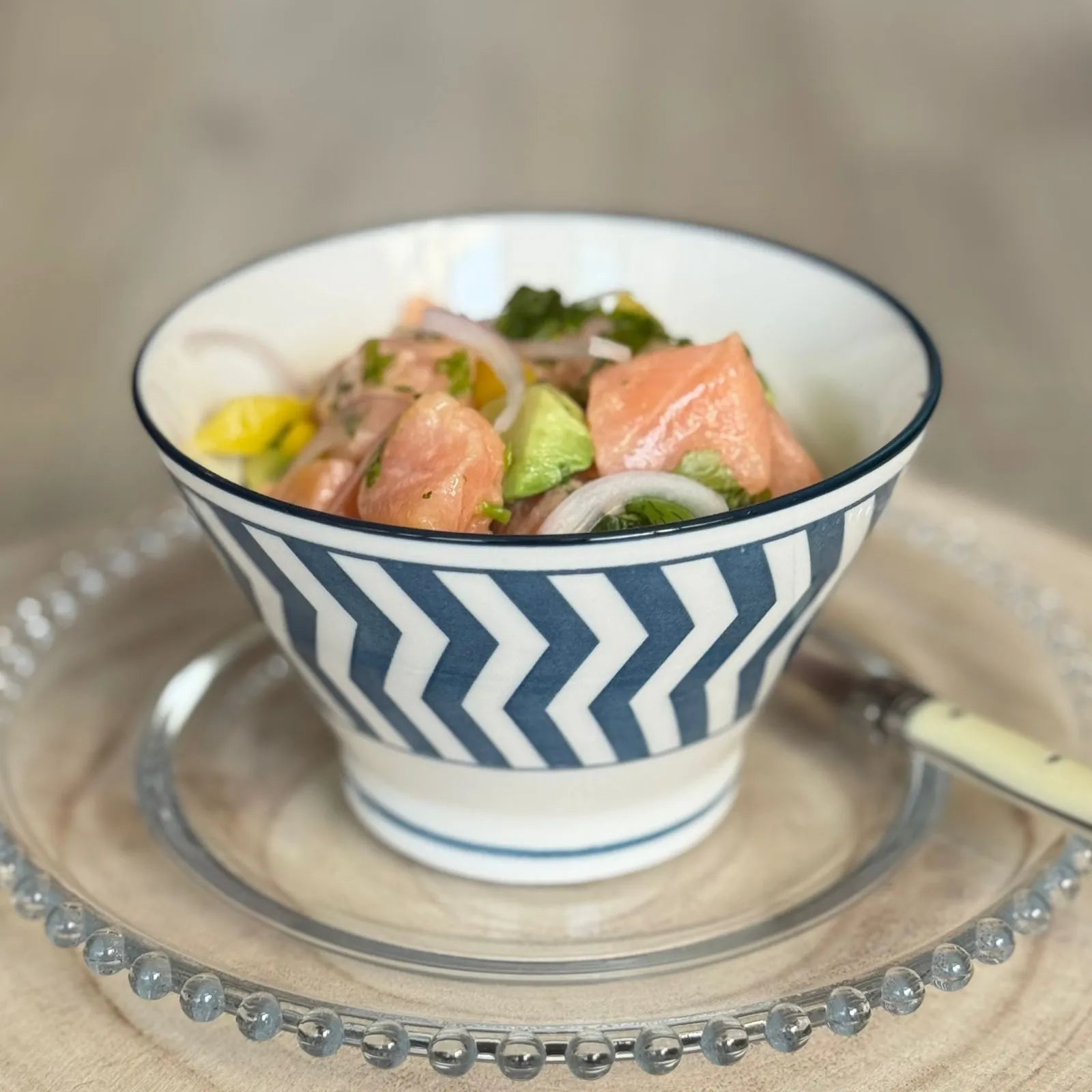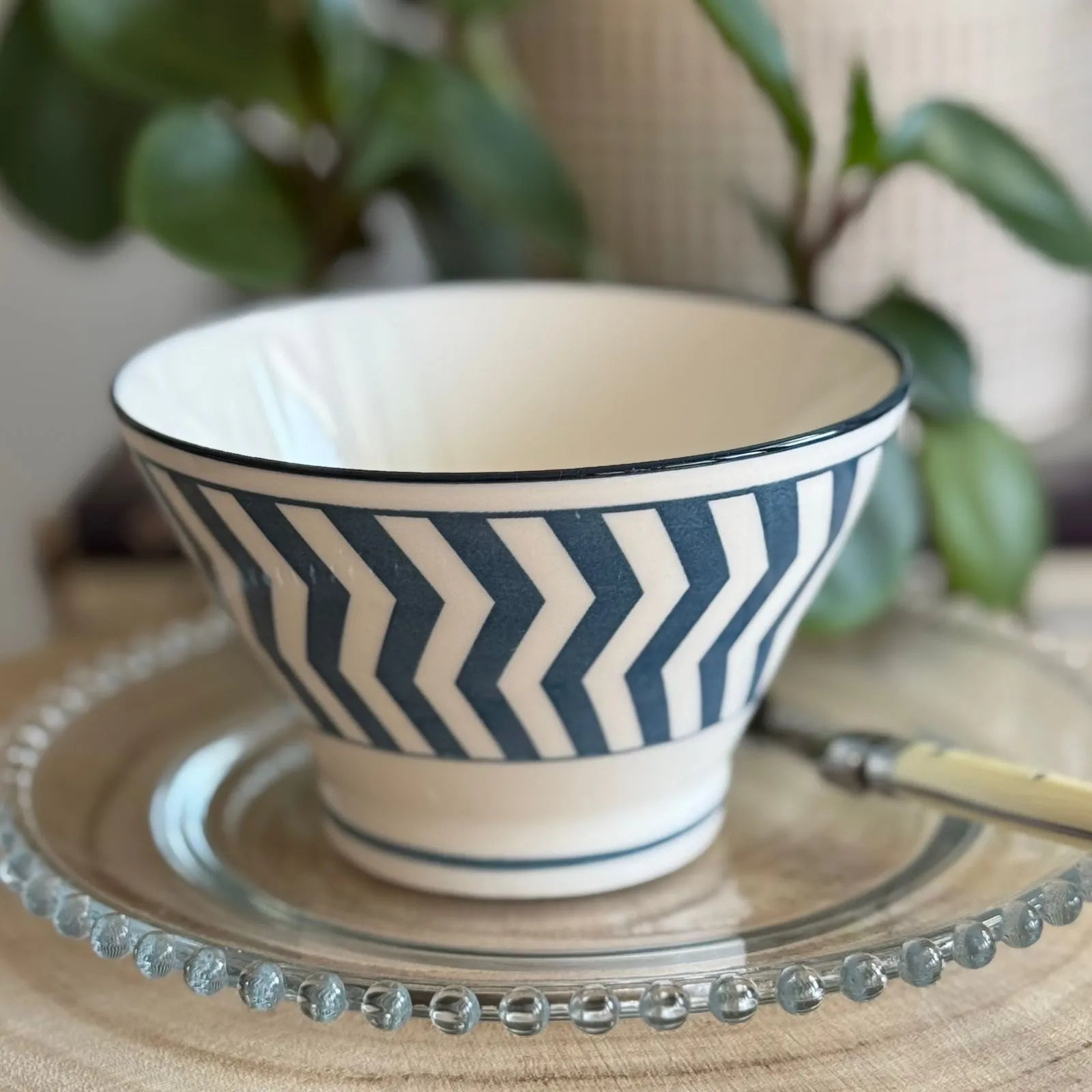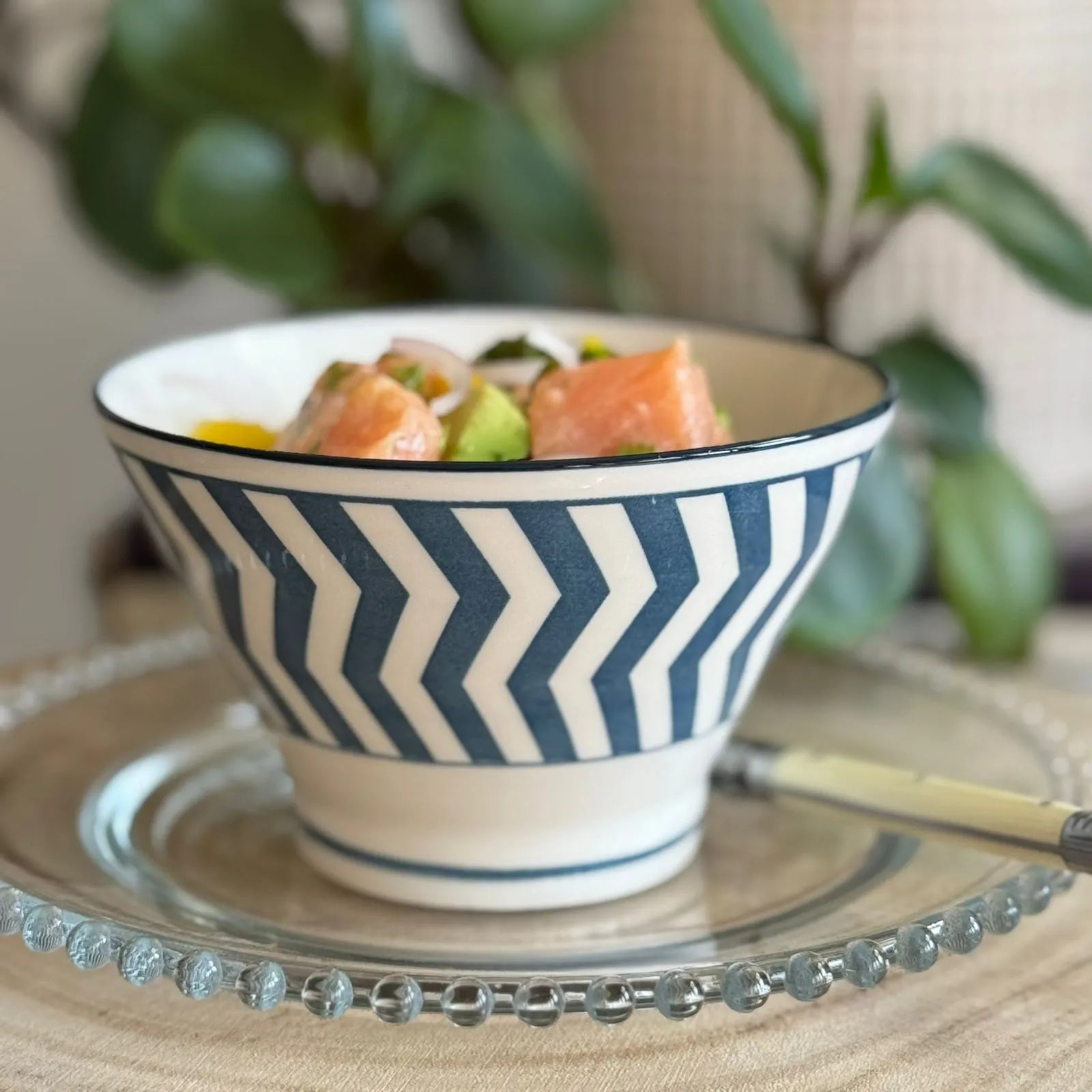 Dale color a tu mesa con nuestro lindo Bowl cónico chevron azul. Su diseño delicado le añade un lindo toque a tu mesa, haciendo que cada comida luzca increíble. Este bowl es de cerámica blanca con un delicado diseño chevron en tono azul, perfecto para el uso que tú quieras, en el puedes servir postres o aperitivos.