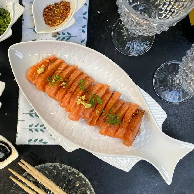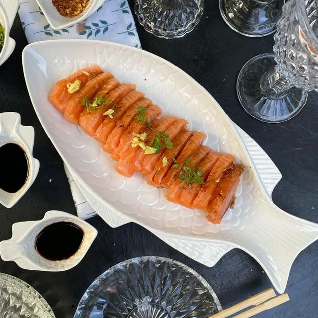 Pon tu mesa preciosa con esta linda Fuente pescado plano escamas M. Su forma de pescado le dará a tu mesa un toque muy original. Su porte es ideal para un sashimi, tiradito o cualquier pescado. Combínalo con nuestros bowls de pescados para un lindo y original regalo.