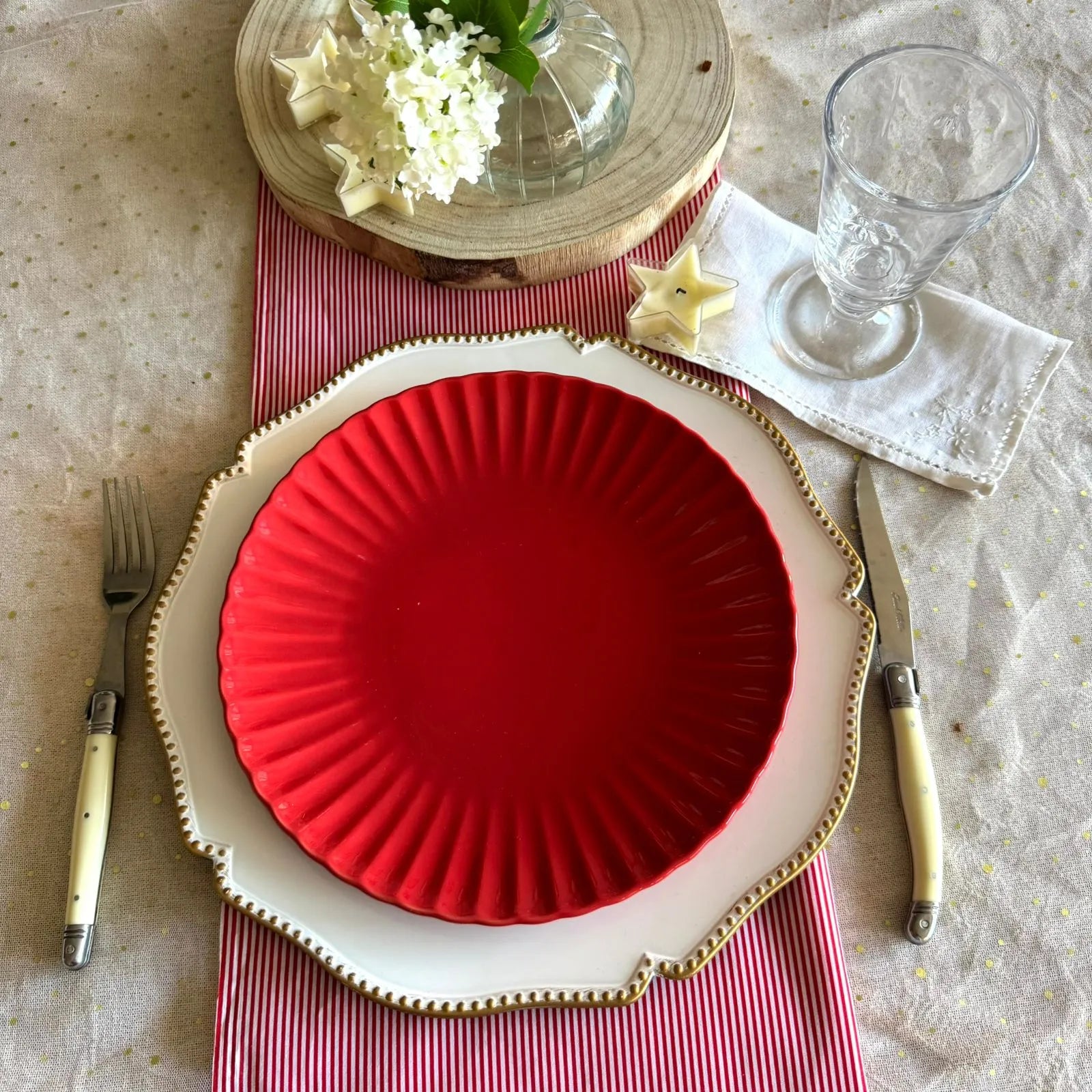 Dale un toque original a tu mesa con el lindo Plato base borde puntos dorado. Combínalo con nuestros manteles estampados o caminos de mesa y con toda nuestra colección de platos para que tu mesa luzca increíble, lo puedes usar como plato base o también para torta o pastelitos. En la mesa navideña da un toque muy especial.