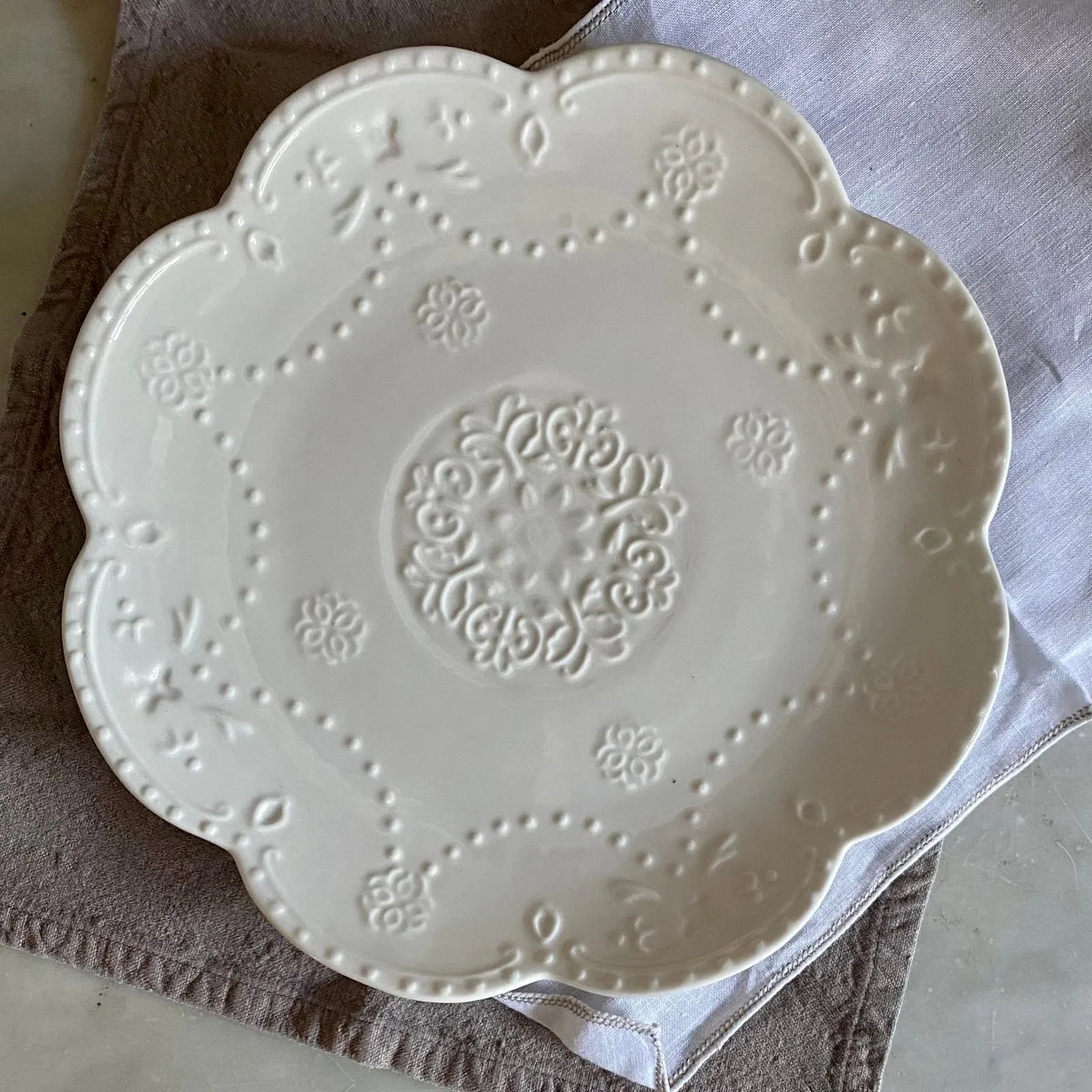 Pon tu mesa preciosa con nuestro lindo Plato blanco flor puntitos L. Este plato plano destaca por su delicado diseño de flor con puntitos en relieve, ideal para poner quequitos, pastelitos o lo que tú quieras. También puedes usarlo como plato de fondo. Es un producto versátil, fácil de combinar, por lo que es perfecto para cualquier ocasión. Disponible en dos portes más para que puedas combinarlos y tener una mesa única.