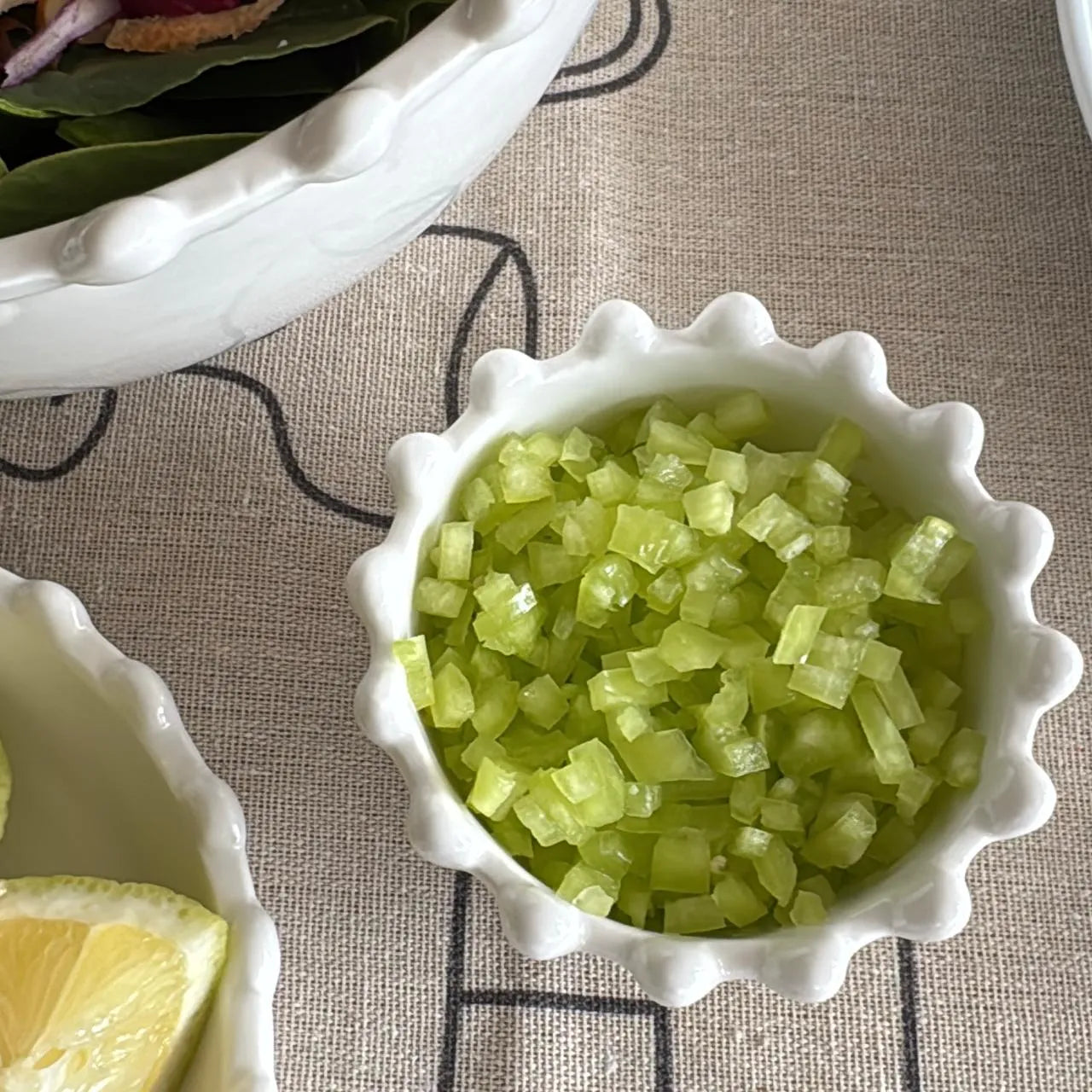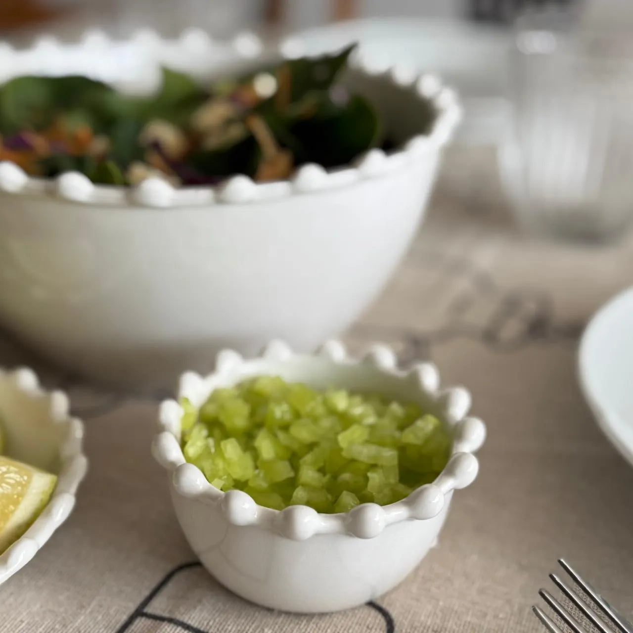Enamórate de este precioso Pocillo XS con pelotitas. Delicado y lleno de encanto, este pocillo XS de cerámica blanca destaca por su borde con detalle de pelotitas, que aporta un toque decorativo único y elegante. Su tamaño compacto lo hace ideal para servir salsas, soya, ají verde o lo que tú quieras. Forma parte de una colección que incluye plato pequeño, bowl grande y plato grande, todos con el mismo diseño distintivo. Perfectos para combinar entre sí y lograr una mesa armónica.