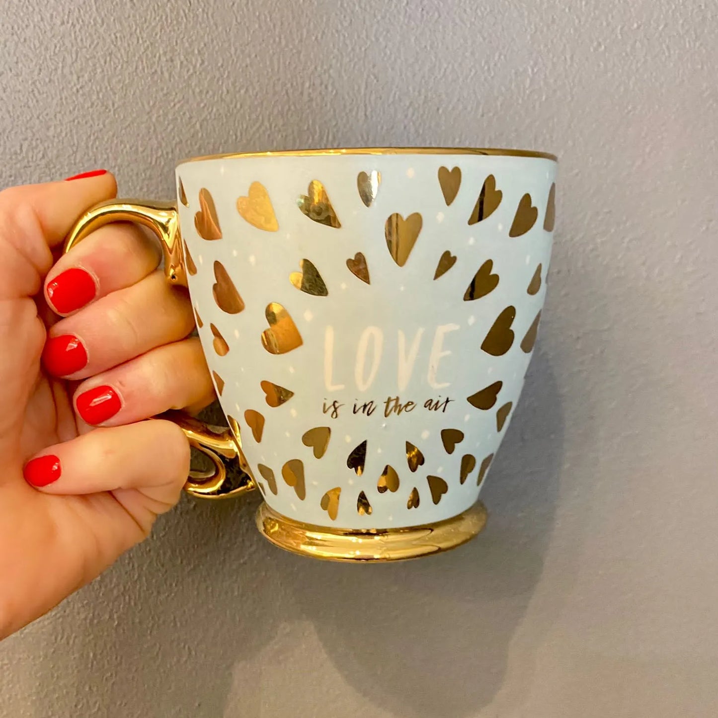Enamórate de este colorido Tazón love. En lindos colores y con mango y detalles dorados, es ideal para el café o el té. Está disponible en varios diseños, revísalos en el selector y elige los que más te gusten.